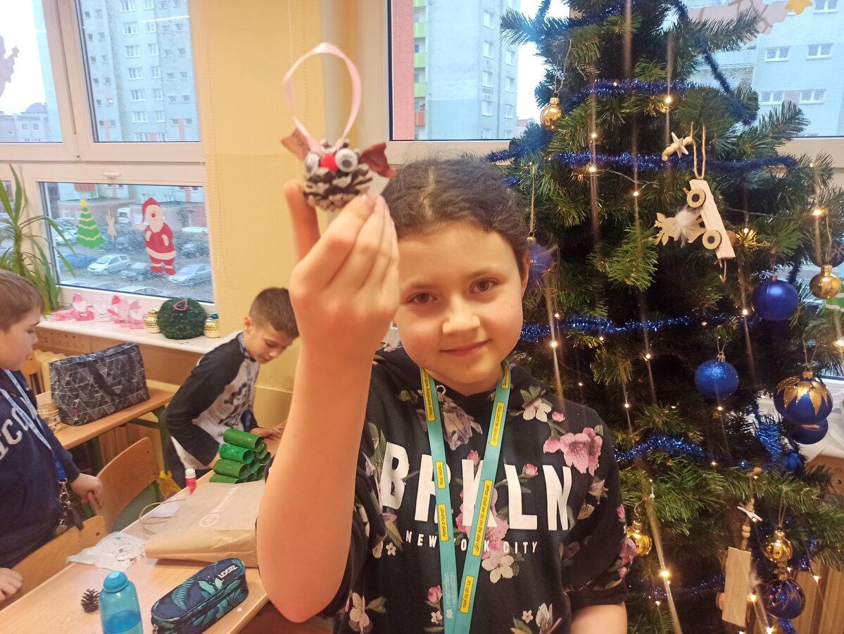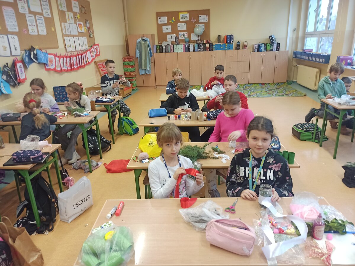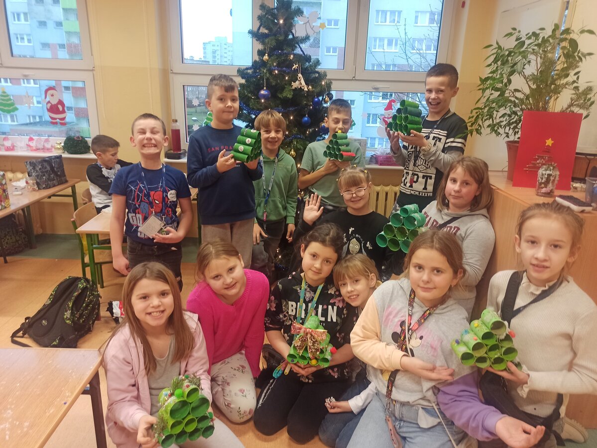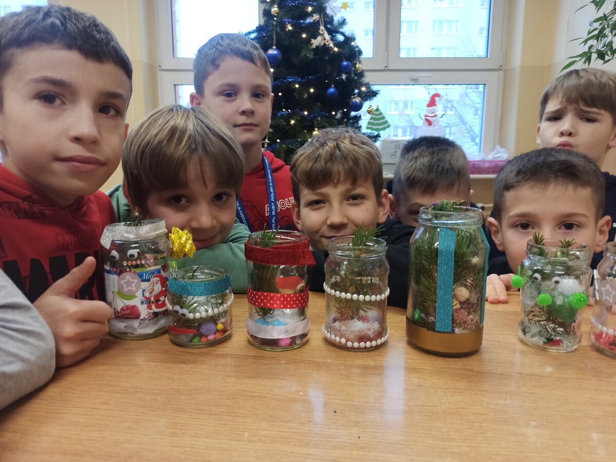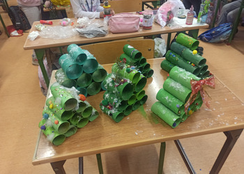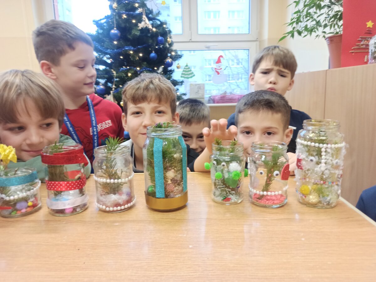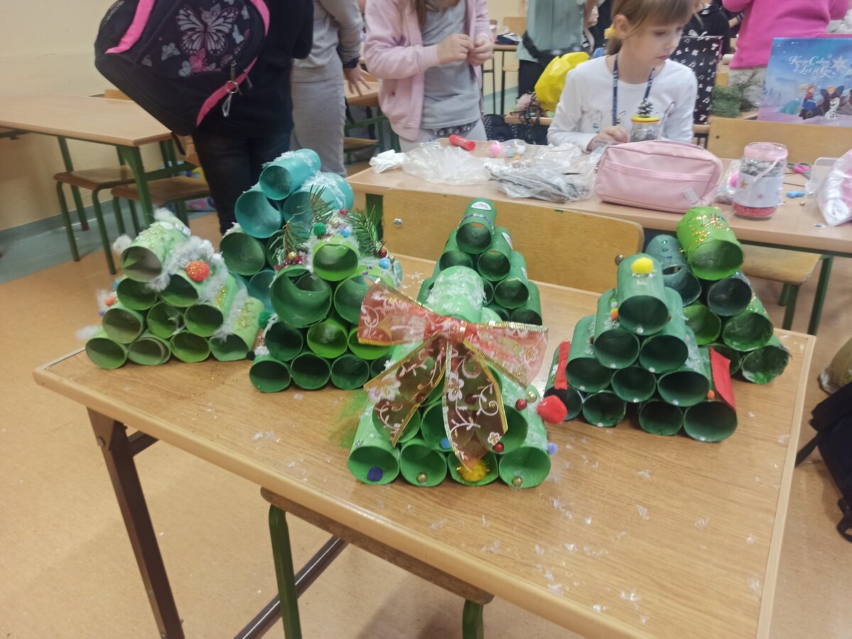 - Podczas pracy wykorzystaliśmy rolki po papierze, aby zrobić z nich piękne choineczki, szyszki stały się reniferami, z patyczków i odrobiny błyszczących ozdób stworzyliśmy piękne choineczki a ze słoiczków, kawałka gałązki iglastej i kilku ozdób- piękny świąteczny stroik. Uczniowie należący do Wielkiej Drużyny Zielonych wykazali się niezwykłą pomysłowością i kreatywnością. A wykonanie takich ozdób było nowym doświadczeniem dla dzieci, przyjętym z dużym entuzjazmem i ekscytacją - relacjonuje Anna Dwórznik - Cieślak, wychowawczyni klasy III e.