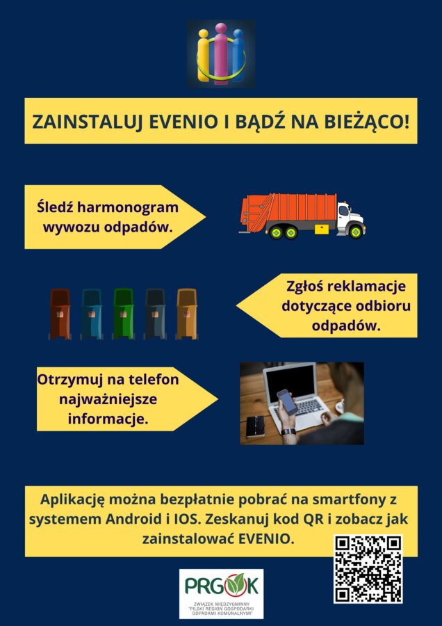 Ale Evenio to nie tylko harmonogram w smarfonie. Za pomocą aplikacji można skontaktować się z biurem obsług klientów Związku Międzygminnego „PRGOK”, zgłaszając w ten sposób m.in. brak odbioru lub brak worków na odpady. Poprzez Evenio wysyłane są również bieżące informacje, m.in. o zamkniętym PSZOK-u czy zmianach w odbiorze odpadów.