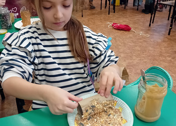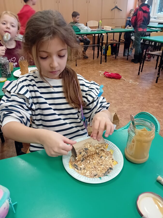 Z rolek po papierze toaletowym uczniowie własnoręcznie wykonali karmniki dla ptaków, dając drugie życie materiałom przeznaczonym do recyklingu. Następnie, podczas wspólnego spaceru w okolicach szkoły, dzieci zawiesiły swoje „ptasie stołówki”, tworząc małą, ekologiczną przestrzeń dla skrzydlatych przyjaciół.