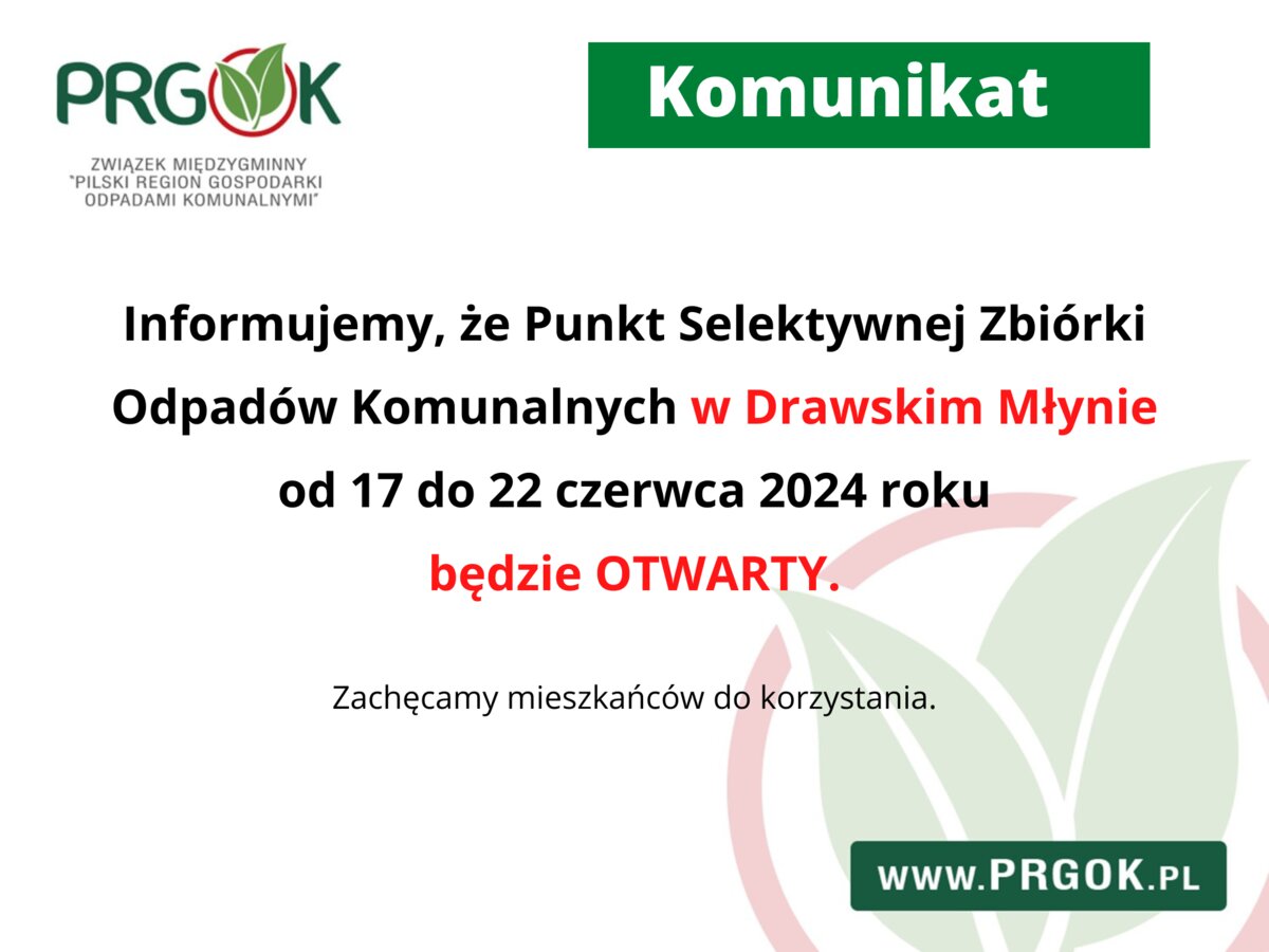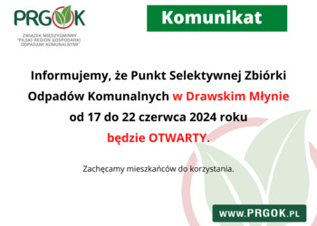 - od 17 do 22 czerwca PSZOK w Drawskim Młynie będzie OTWARTY.