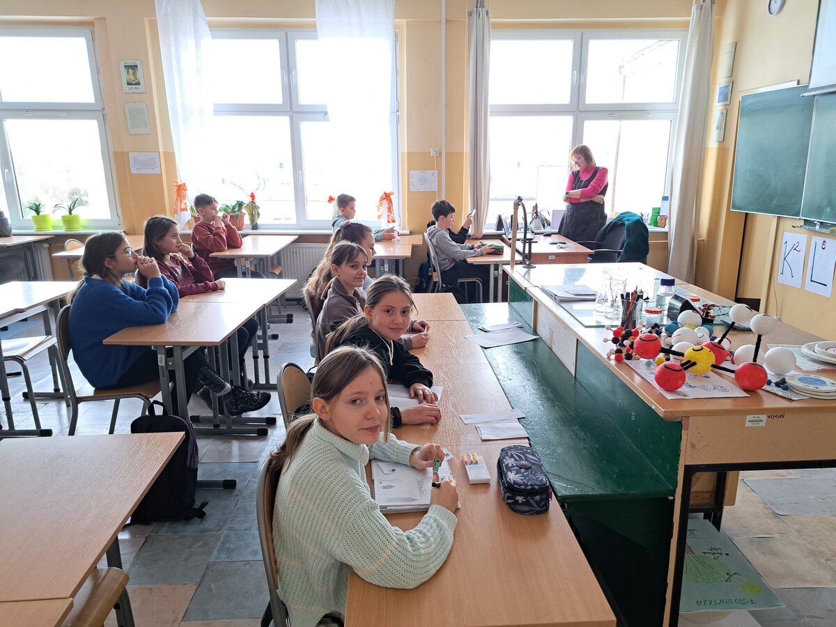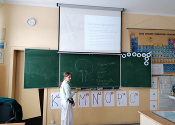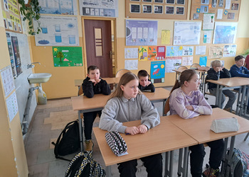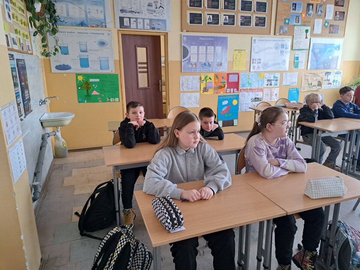 Podczas spotkania z pracownikiem Biura Związku Międzygminnego "PRGOK" uczniowie dowiedzieli się jak powstaje szkło i papier, jakie odpady należy wyrzucić do zielonego i niebieskiego pojemnika, a co nie powinno tam trafić.
