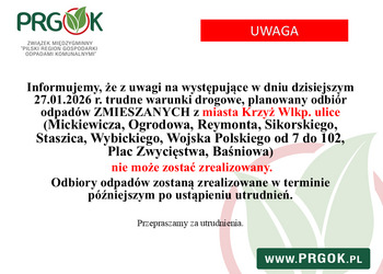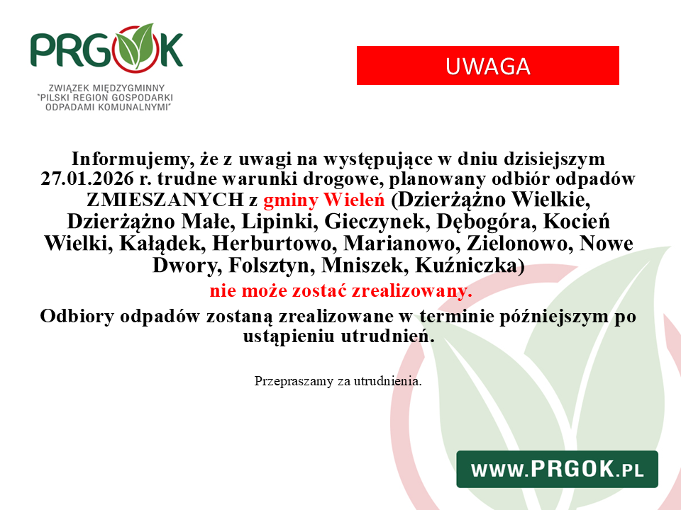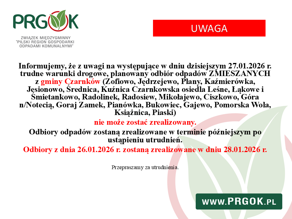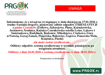 UWAGA - utrudnienia w odbiorach odpadów w gminach Czarnków, Krzyż Wlkp., Wieleń - 27.01.2026