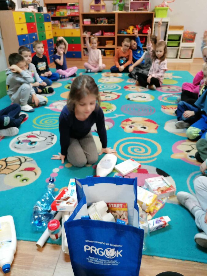 W ramach programu "Klas Patronackich" Związku Międzygminnego "PRGOK" dzieci wzięły udział w zajęciach ekologicznych poświęconych recyklingowi szkła i papieru. Przedszkolaki m.in. wysłuchały bajki o lesie i dowiedziały się, że papier powstaje z drewna. Dzieci zgodnie przyznały, że trzeba oszczędzać papier i zbierać makulaturę, żeby nie trzeba było wycinać drzew.